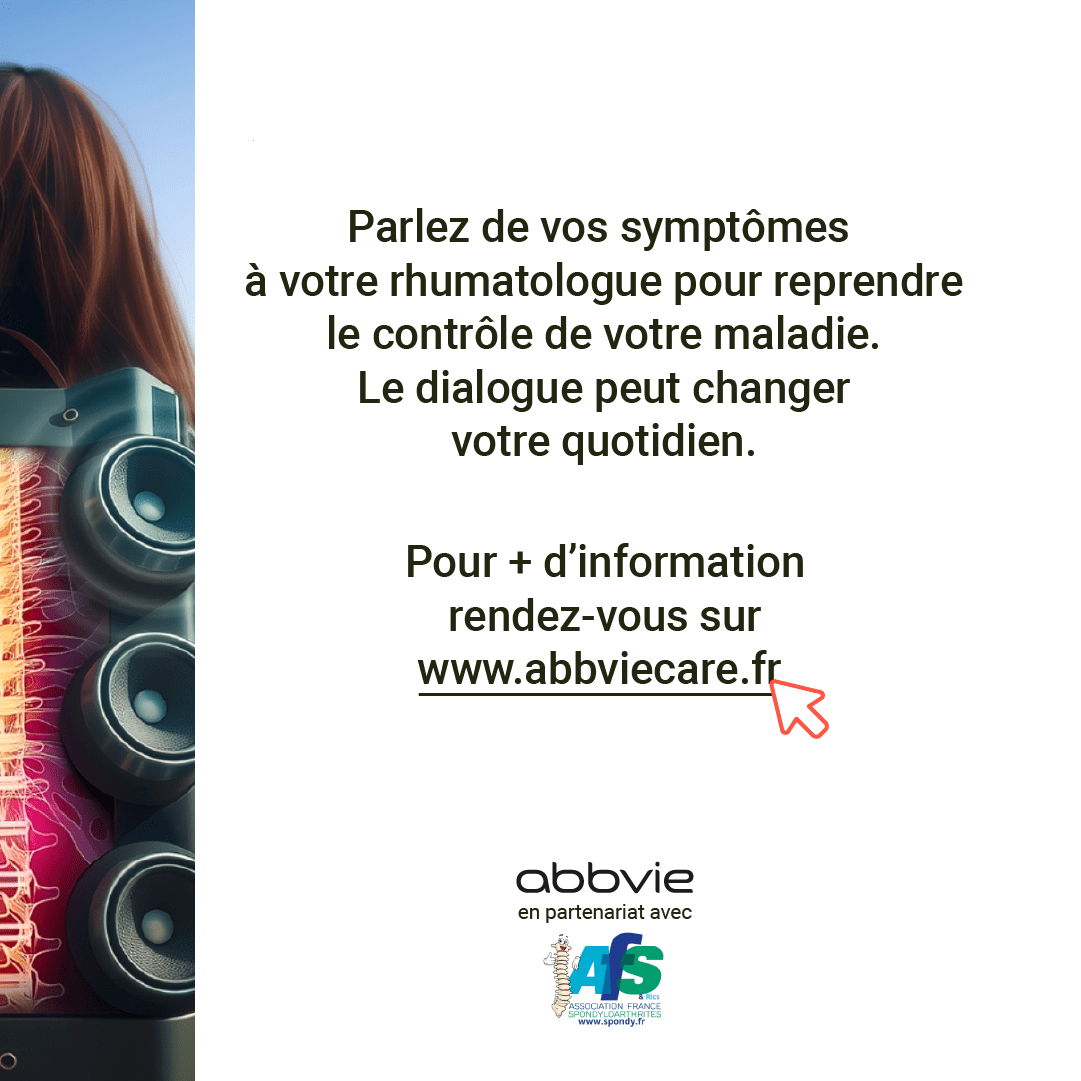 -Rendez-vous sur abbviecare.fr et découvrez notre guide de conversation pour vous aider à préparer dès maintenant votre prochaine consultation avec votre rhumatologue.