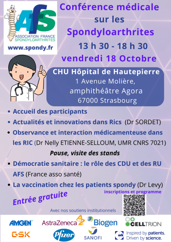 L’AFS est heureuse de vous proposer une conférence médicale sur les spondyloarthrites, en présentiel au CHU Hôpital de Hautepierre 1 Avenue Molière, amphithéâtre Agora 67000 Strasbourg.