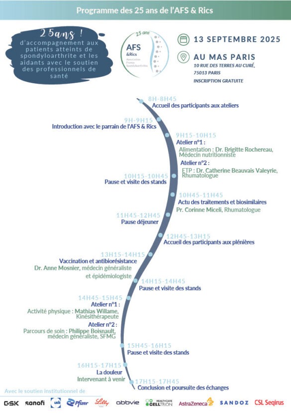 L’Association France Spondyloarthrites & Rics a le plaisir de vous convier à une journée exceptionnelle à l’occasion de ses 25 ans d’engagement auprès des malades atteints de spondyloarthrites, et leurs proches