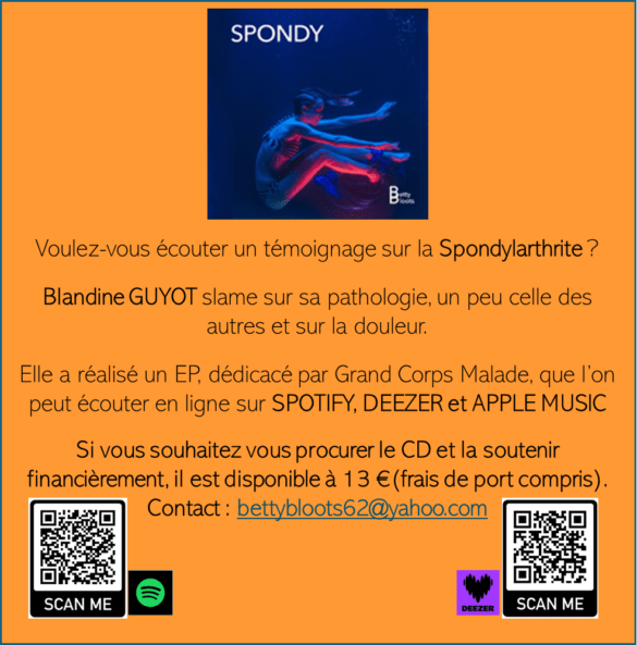 Elle a toujours eu envie de les faire mettre en musique et de les slamer. Au bout de 4 années de travail, avec de jeunes compositeurs amateurs, son album Spondy est sorti. C’est un témoignage sur sa vie avec la maladie.
